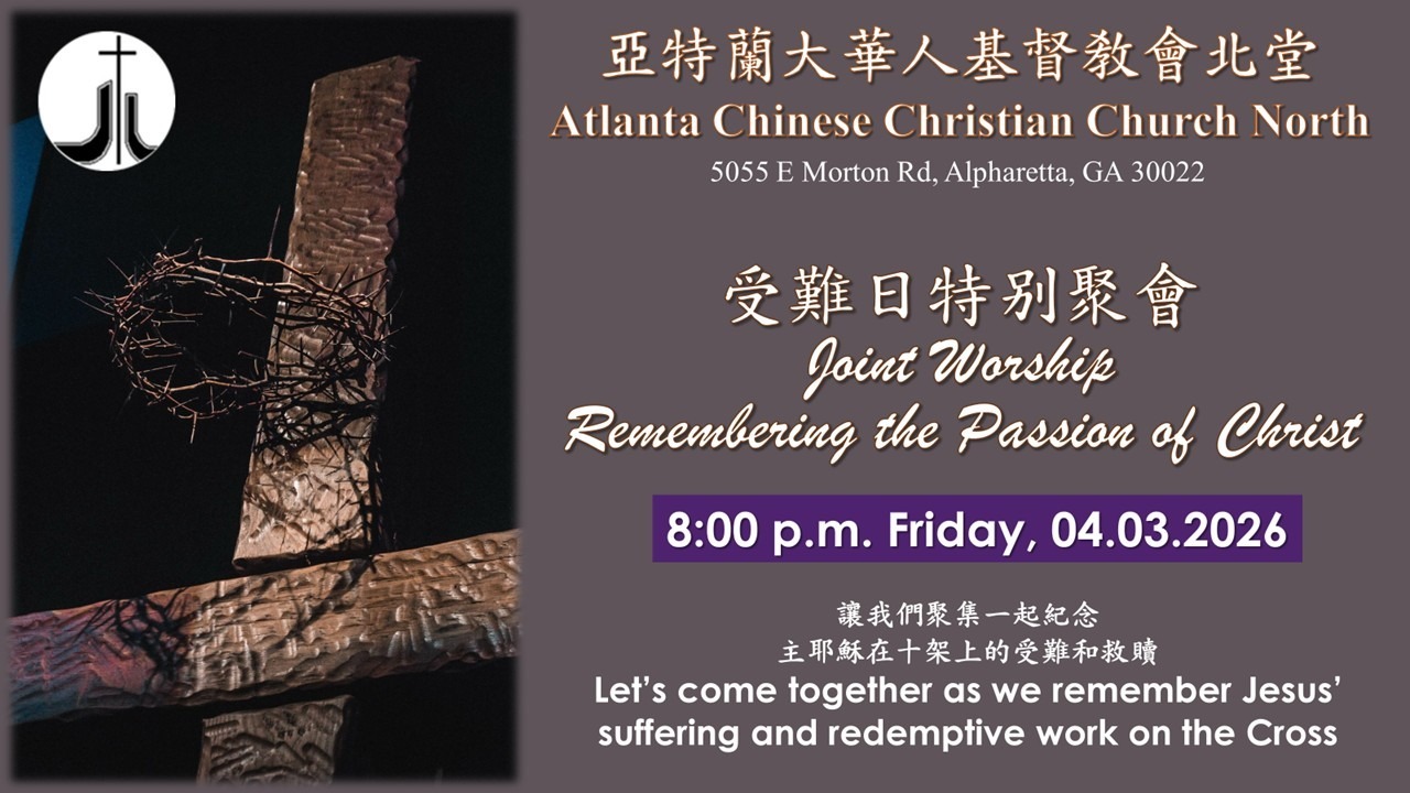 8:00 PM Friday, 4/3/2026. 让我们聚集一起纪念住耶稣在十架上的受难和救赎。