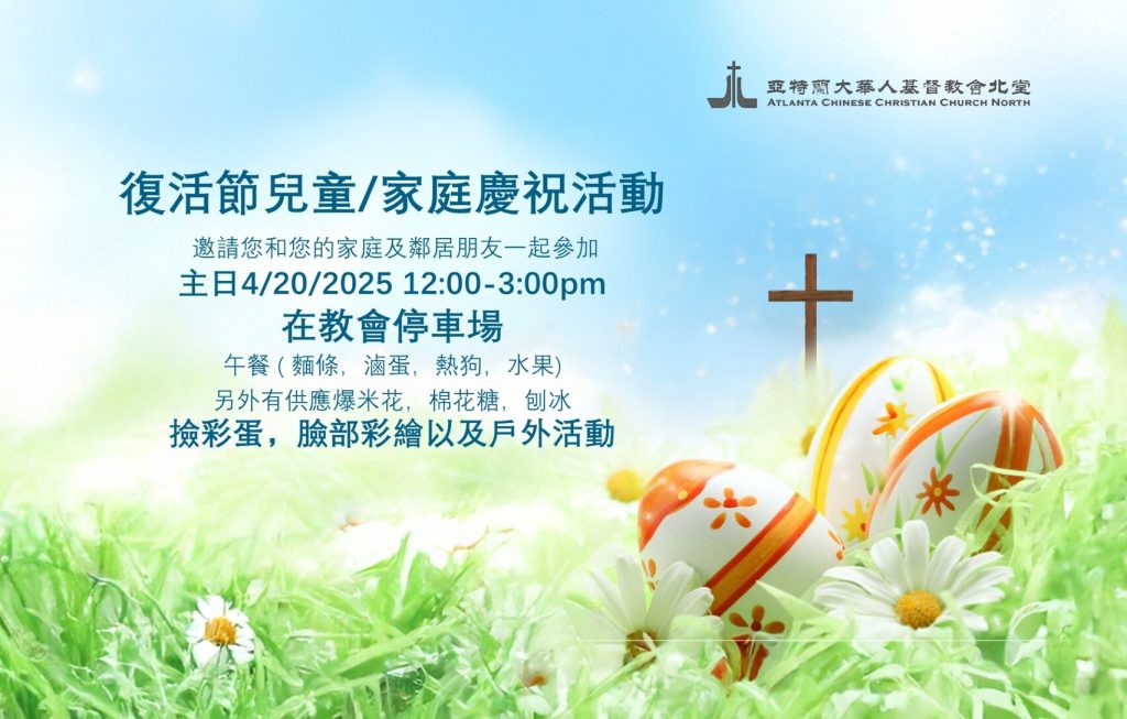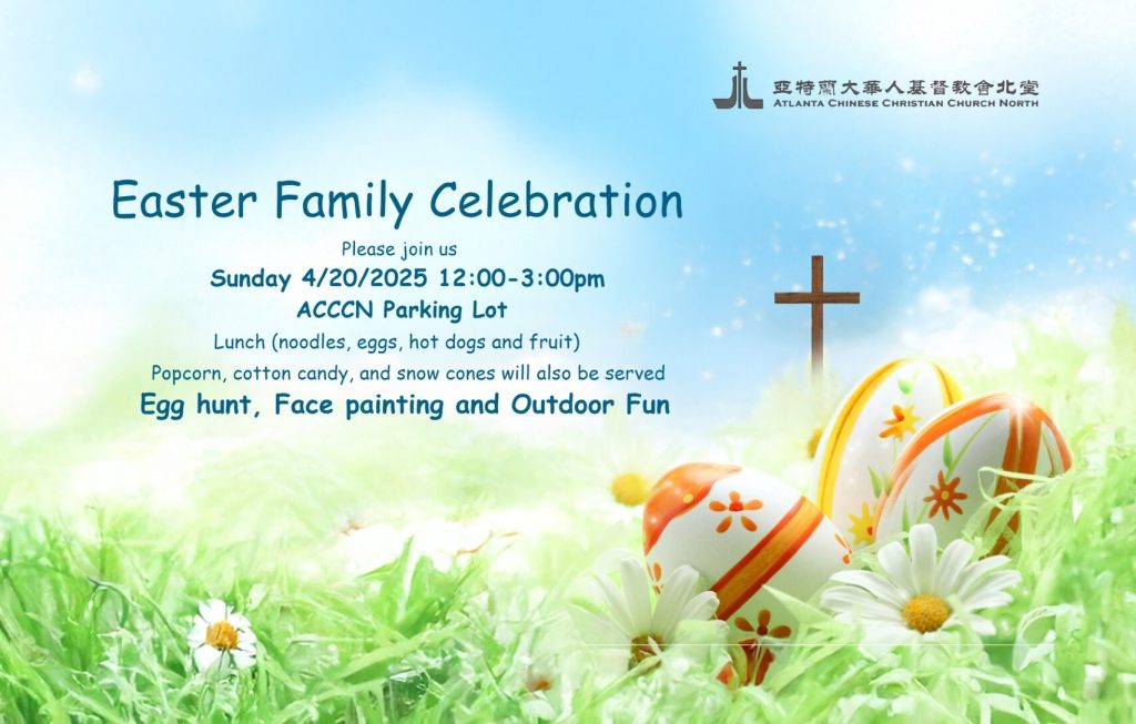复活节家庭庆祝活动 我们诚挚邀请各位家庭参加 ACCCN 的复活节家庭庆祝活动。活动包括简短的敬拜仪式、复活节彩蛋寻宝、儿童面部彩绘以及茶点。这是一个轻松愉快的家庭时光,适合所有年龄段的人们一起庆祝希望和新生。