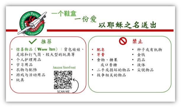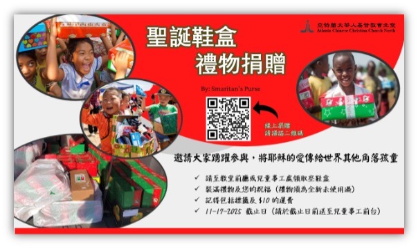 “圣诞鞋盒礼物”捐赠 邀请大家踊跃参与,将耶稣的爱传给世界其他角落孩童。空鞋盒请至教会前廊或儿童事工处领取。 11/17前将装满礼物(须为全新未使用过)和您的祝福的鞋盒、并标签及$10运费,送至儿童事工处或网上捐赠。