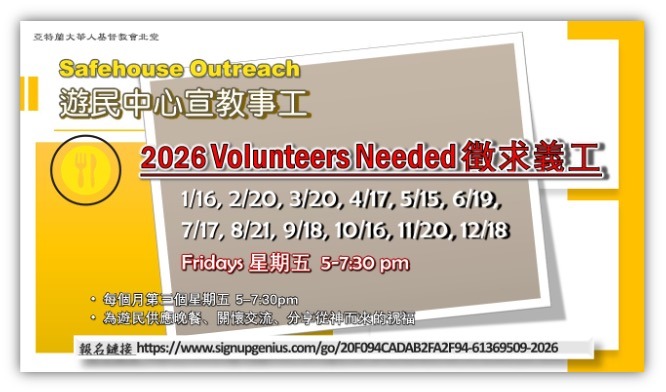 每个月第三个星期五 5-7.30pm。为游民供应晚餐、关怀交流、分享从神而来的祝福。报名链接 https://www.signupgenius.com/go/20F094CADAB2FA2F94-61369509-2026