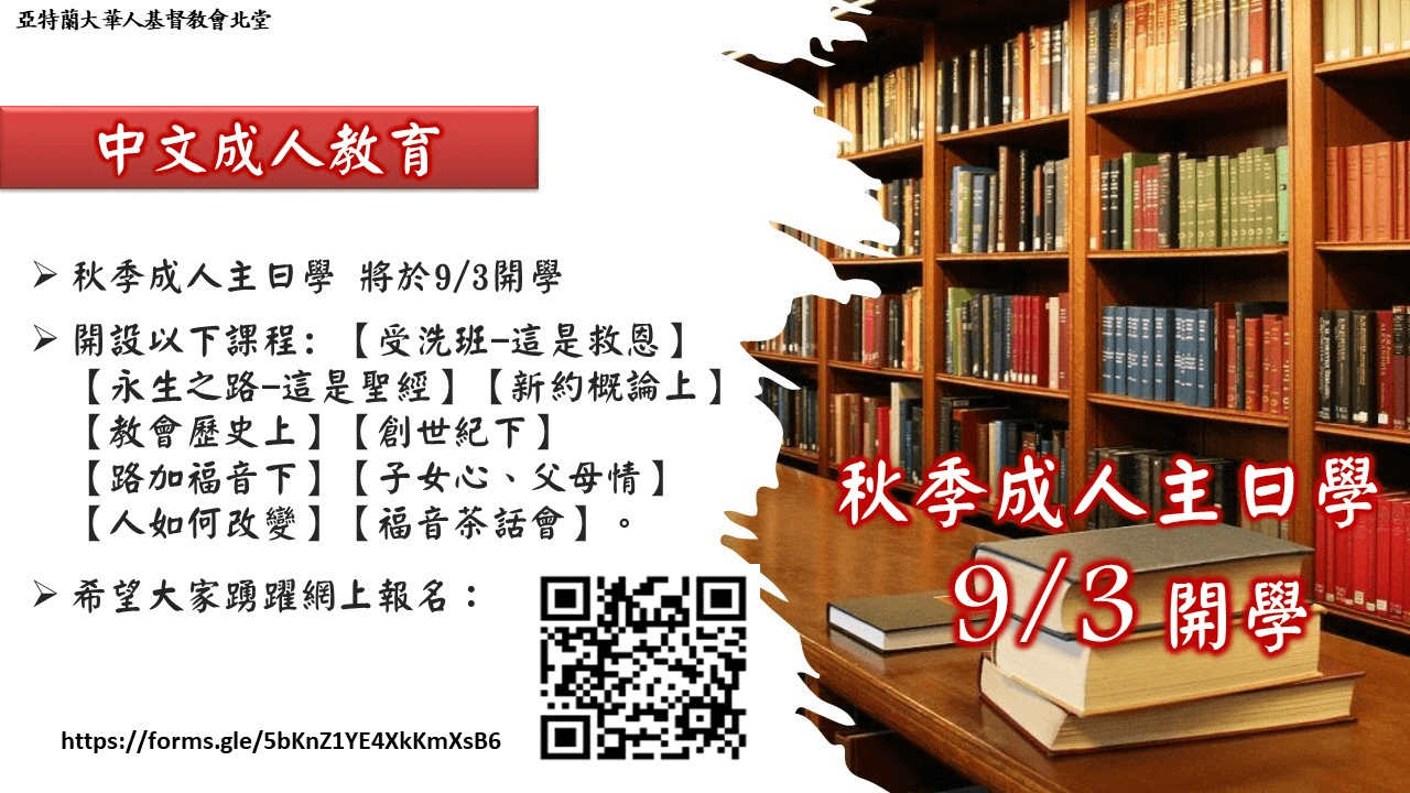 秋季成人主日學將於9/3開學,開設以下課程:【福音茶話會】【受洗班-這是救恩】【永生之路-這是聖經】【新約概論上】【教會歷史上】【創世紀下】【路加福音下】【子女心、父母情】【人如何改變】。希望大家踴躍網上報名:https://forms.gle/5bKnZ1YE4XkKmXsB6